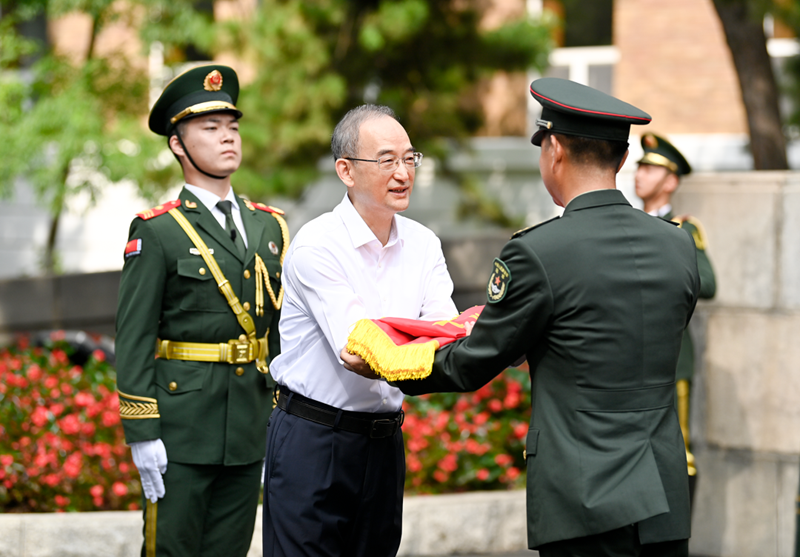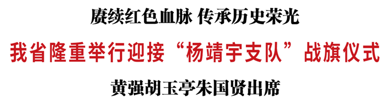 9月14日,我省在中共吉林省委机关隆重举行迎接“杨靖宇支队”战旗仪式,以最高礼遇致敬这面英雄的旗帜、胜利的旗帜、不朽的旗帜,赓续红色血脉,传承东北抗联精神,弘扬伟大抗战精神,激励全省上下牢记习近平总书记殷殷嘱托,踔厉奋发、勇毅前行,奋力推动吉林全面振兴和高质量发展。省委书记、省人大常委会主任黄强,省委副书记、省长胡玉亭,省政协主席朱国贤出席仪式。