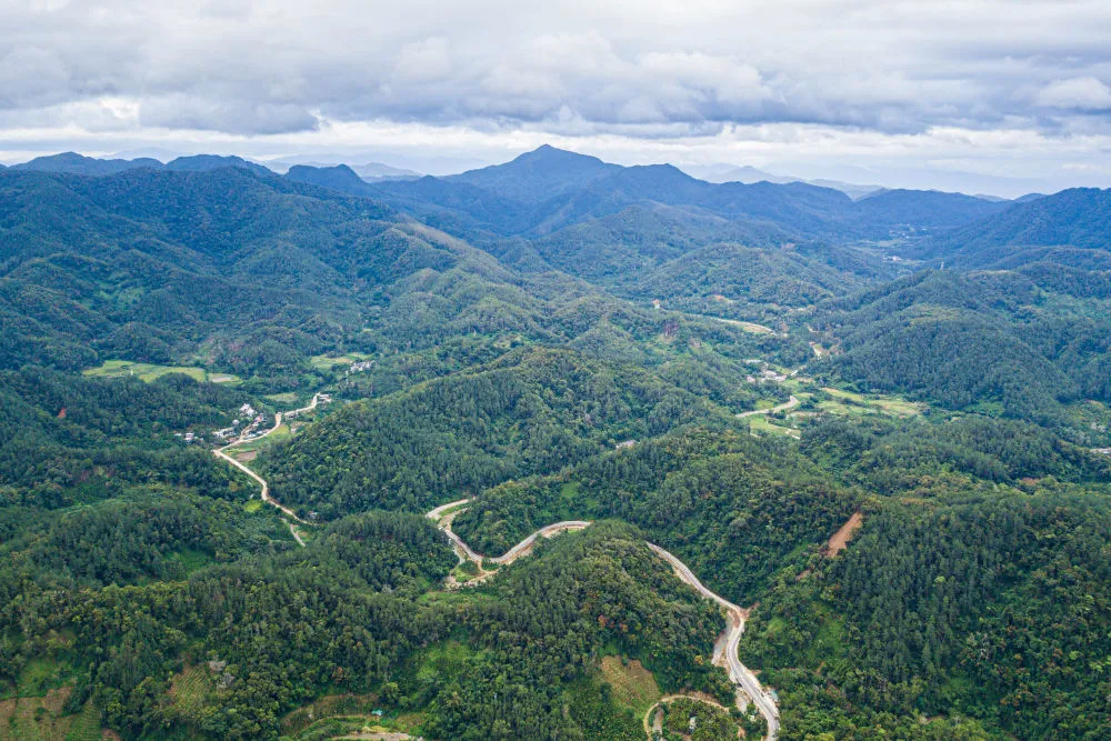 这是2025年7月22日在海南省保亭黎族苗族自治县毛感乡拍摄的热带雨林及蜿蜒其中的环热带雨林国家公园旅游公路(无人机照片)。新华社记者 蒲晓旭 摄
